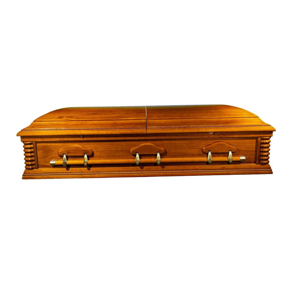 Material: Manufactured from high-quality MDF (Medium-Density Fibreboard Wood), ensuring durability, structural stability, and a smooth premium finish.Exterior Finish: Elegant white high-gloss style finish with decorative silver-tone ornamental handles and detailing, giving the casket a distinguished and refined look.Interior: Fully lined with a soft white interior fabric, providing a clean, peaceful, and respectful presentation.Design: Classic split-lid (half couch) design, allowing the upper section to be opened during viewing services while maintaining dignity and structure.